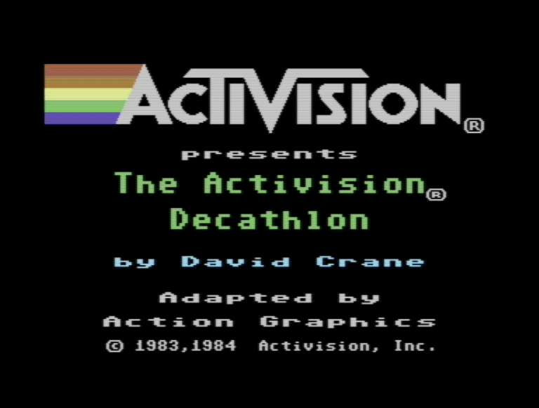 Activision was based in California and in 1983, it was one year until the Olympics in Los Angeles. For his next game for the Atari 2600, David Crane decided to turn to athletics, and a simulation of the decathlon, ten events in one. He put his graphics skills to use in making some impressive running animations and a scrolling track, and came up with something which would provide a physical endurance test itself in addition to a test of skill. Every event involves running by waggling the joystick left and right. In this he may have taken influence from Microsoft’s Olympic Decathlon, which came out on the TRS-80 back in 1980, the year of the previous summer Olympics. Olympic Decathlon involved pressing two alternating keys, although with much more basic graphical illustration.